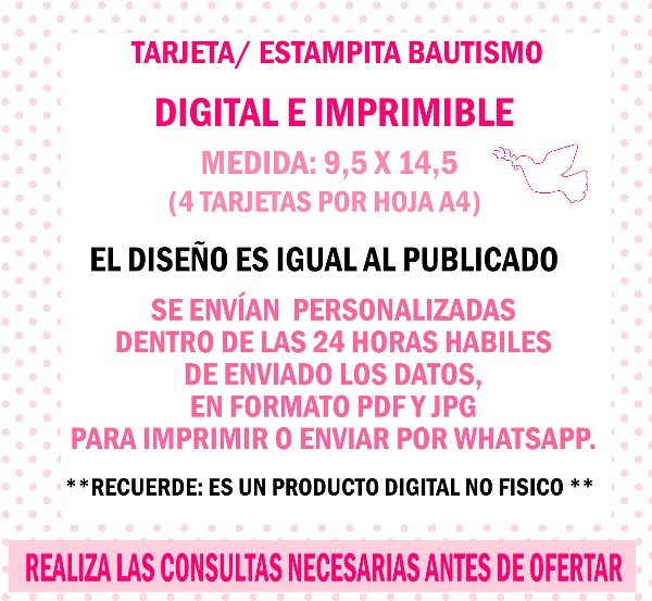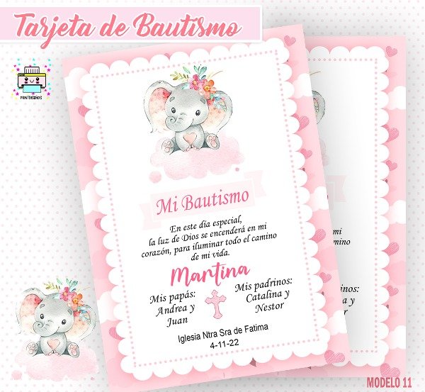 TARJETA ESTAMPITA BAUTISMO ELEFANTITA NIÑA PERSONALIZADA LISTA PARA IMPRIMIR