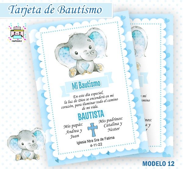 TARJETA ESTAMPITA BAUTISMO ELEFANTITO VARÓN PERSONALIZADA LISTA PARA IMPRIMIR