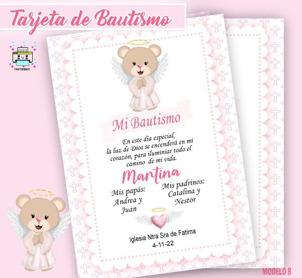 TARJETA ESTAMPITA BAUTISMO OSITA NIÑA PERSONALIZADA LISTA PARA IMPRIMIR