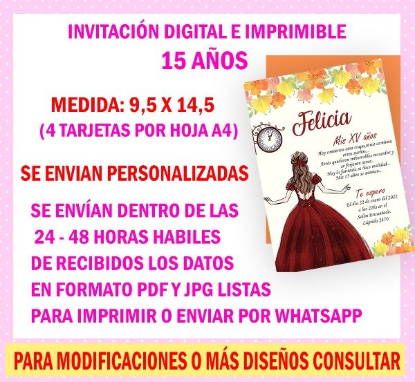 Te enviamos el diseño por MAIL para que imprimas en tu casa o gráfica en formato PDF (no editable) y una sola imagen para que envíes por WhatsApp.